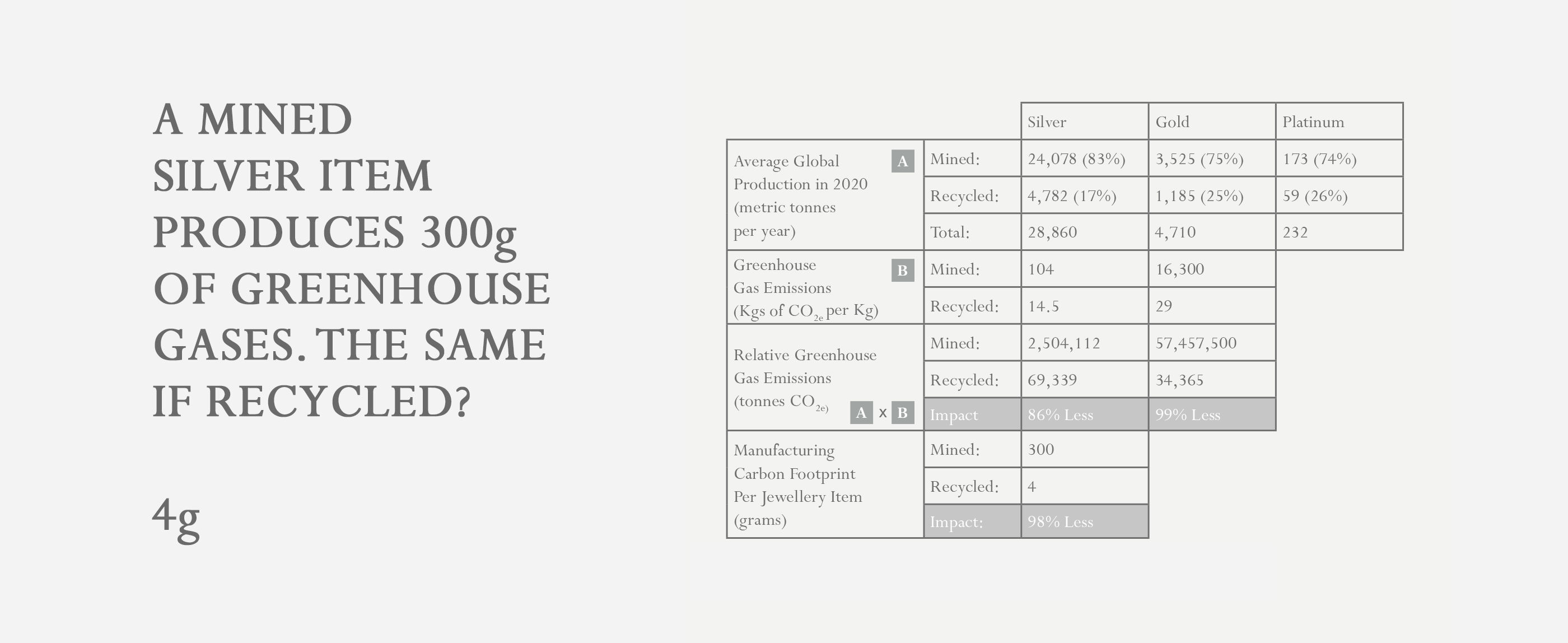 Sources: World Gold Council, 2020. Gold Production Statistics | Johnson Matthey PGM Market Report, 2020 | The Silver Institute, Silver Supply & Demand, 2020 | Chulalongkorn University, Silver GHG Emissions